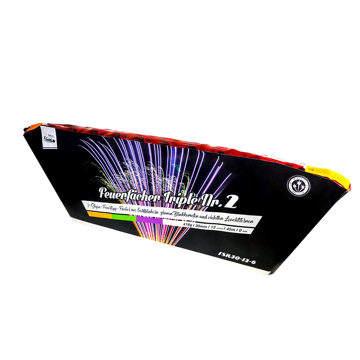 3-Stufen-Feuertopf-Fächer aus Goldblinkern, grünen Blinkkometen und violetten Leuchtsternen